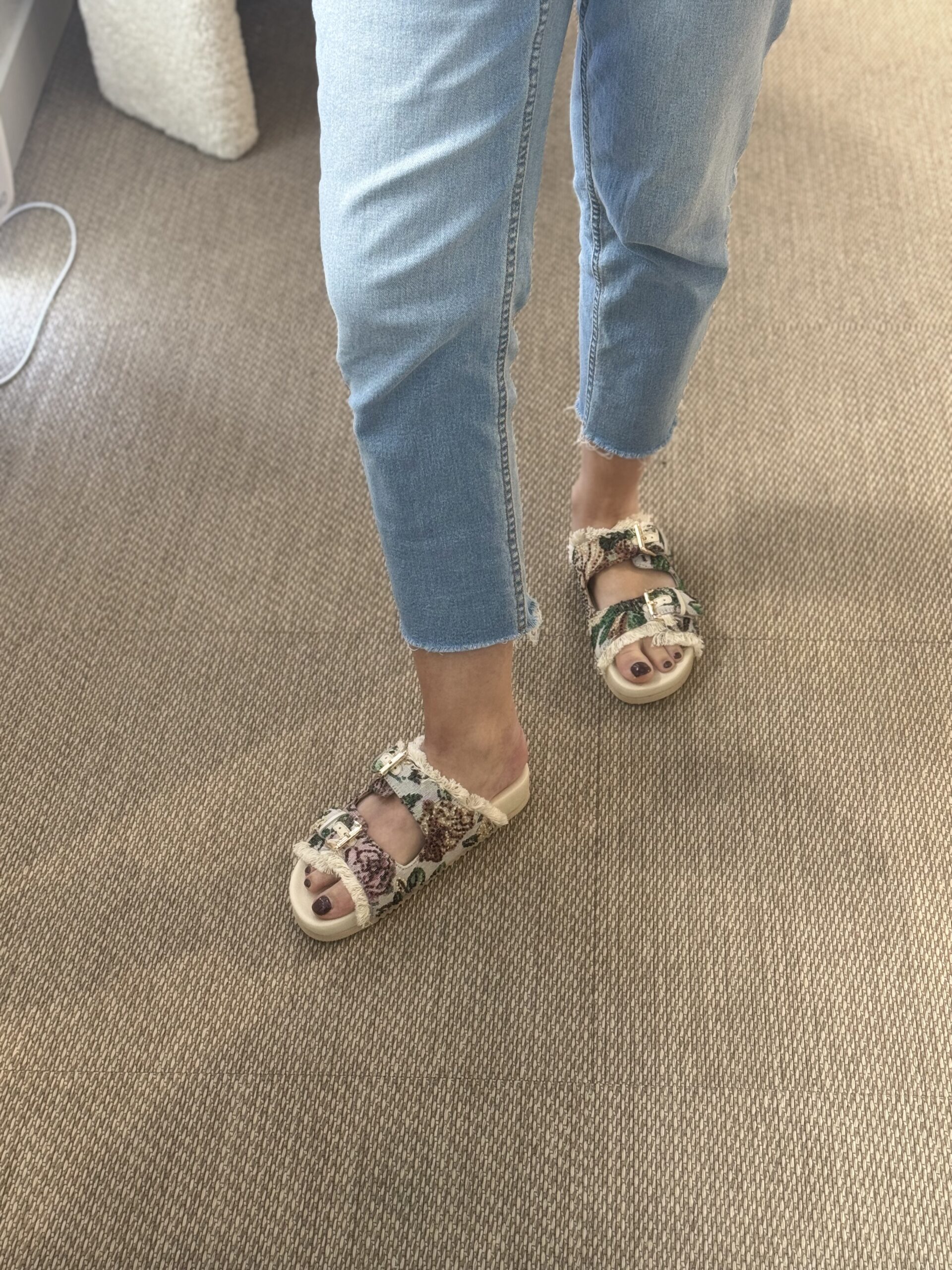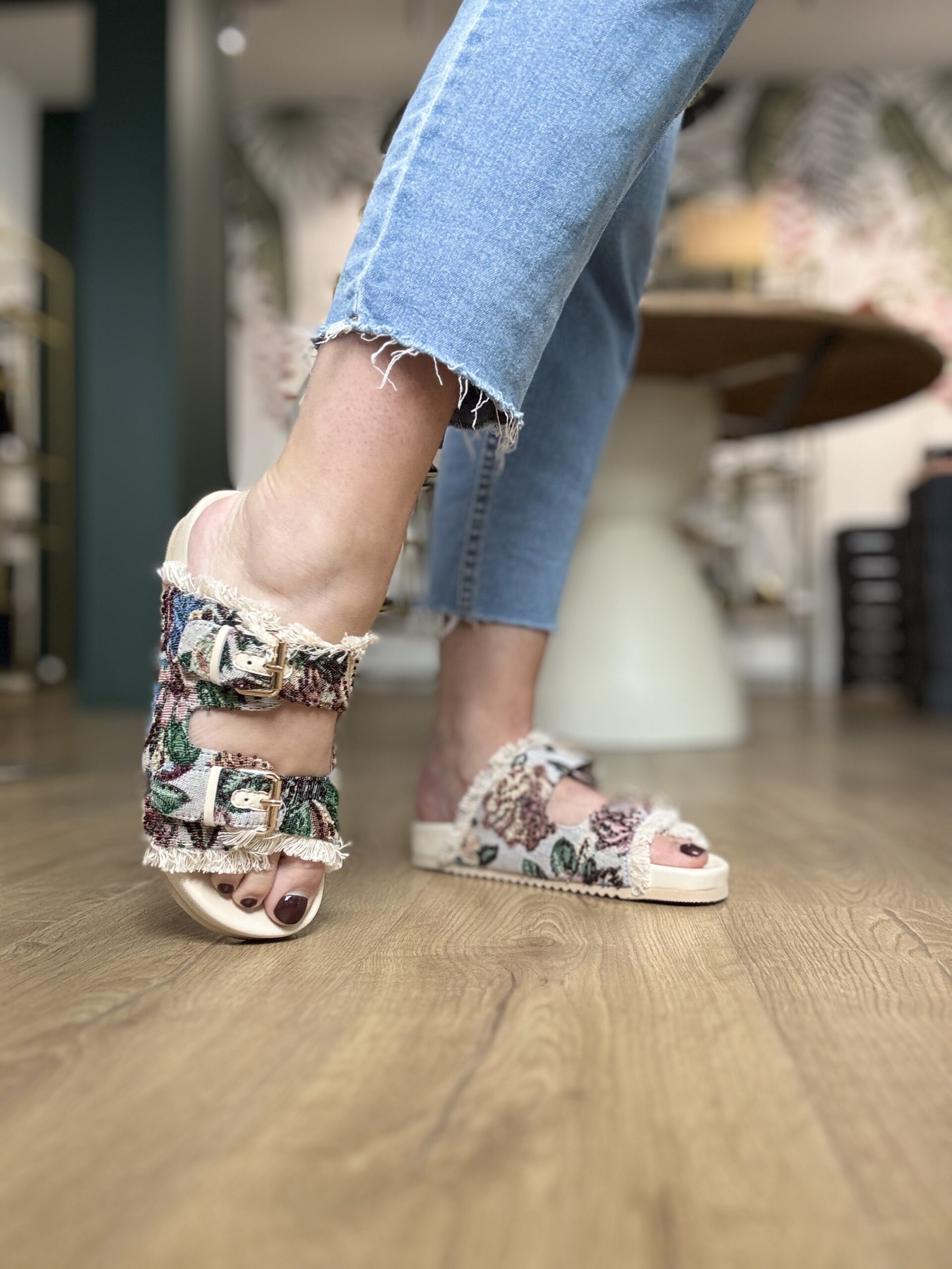 Ces sandales plates Bibi Lou fleurs en cuir souple beige parsemé de motifs floraux brodés multicolores (rose, vert, blanc) apportent une touche artisanale joyeuse. Brides croisées enveloppantes avec boucles réglables pour personnalisation parfaite, semelle extérieure gomme épaisse antidérapante, intérieure coussinée respirante. Bout ouvert généreux pour aération pieds.