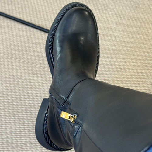 Fabriquée en cuir noir véritable, elle se distingue par sa tige haute ajustée, qui épouse naturellement la jambe et affine la silhouette. La semelle épaisse assure stabilité et résistance, tandis que le petit détail métallique discret renforce l’identité chic et moderne de la marque. Chaque finition est pensée pour offrir une chaussure à la fois fonctionnelle et élégante, capable de vous accompagner au quotidien comme lors de vos sorties habillées.