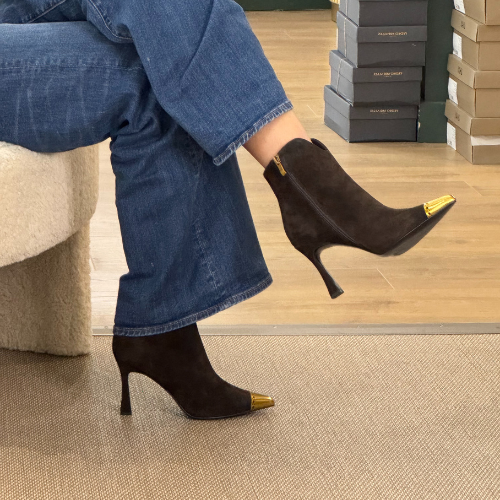 Le détail qui fait toute la différence ? Son bout doré métallique, raffiné et lumineux, qui attire le regard et signe un style unique. Cette finition haut de gamme donne du caractère à la bottine, la transformant en pièce maîtresse de vos tenues.