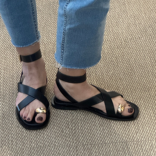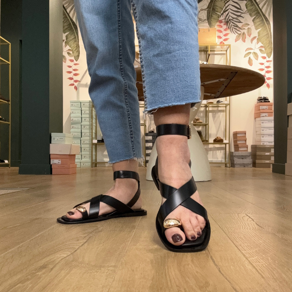 Découvrez les sandales bijoux pied doré Bibi Lou, un modèle sophistiqué en cuir noir avec brides cheville et détails strass dorés scintillants. Ces sandales Bibi Lou noir doré affichent des brides croisées à la cheville réglable par boucle, ornées de strass et perles dorées au pied pour un effet bijoux festif. Semelle plate en cuir pour un confort espadrille, bout ouvert et talon minimal.