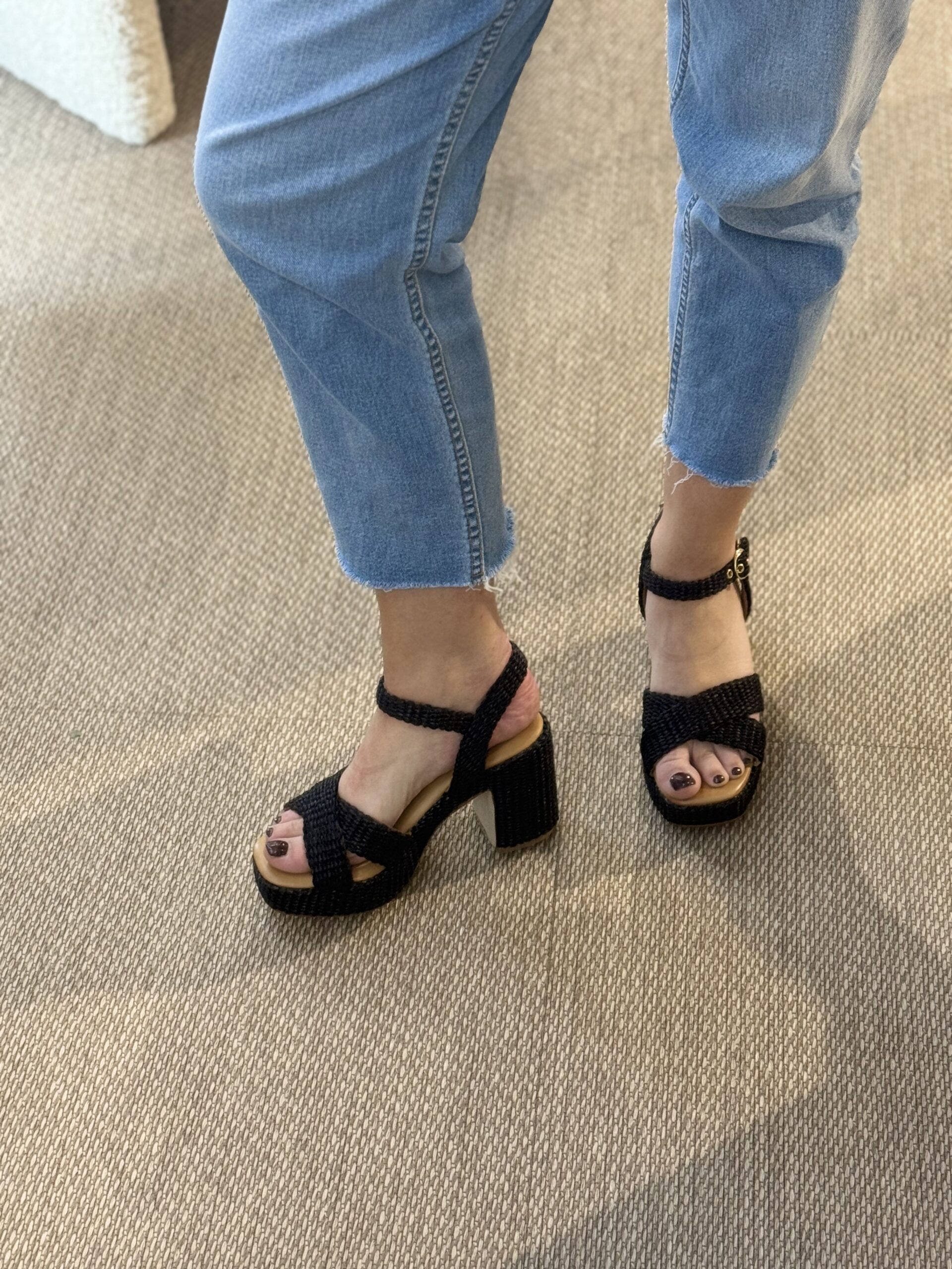 Ces sandales plateforme Sandro Rossi noires en raphia tressé noir mat affichent une forme sabot ouverte avec brides croisées géométriques à l’avant, bride cheville à boucle dorée pour maintien sécurisé. Plateforme compensée de 7-8 cm (talon 5 cm) en bois ton sur ton, semelle intérieure en mémoire de forme qui s’adapte au pied pour amorti personnalisé et anti-fatigue. Semelle extérieure crantée antidérapante.